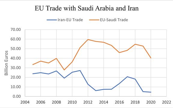 By contrast, trade between the EU and Saudi Arabia, Tehran’s chief rival in the Persian Gulf, benefits from diplomatic stability. Since 2005, EU-Saudi trade has enjoyed a general upward trajectory, even though it is sensitive to volatile markets for oil. However, the Saudis have managed to expand their non-crude exports to the EU. In 2020, 7.2 billion euros — 46 percent of Riyadh’s exports to the EU — were from non-crude oil, up from 3.84 billion euro in 2005.