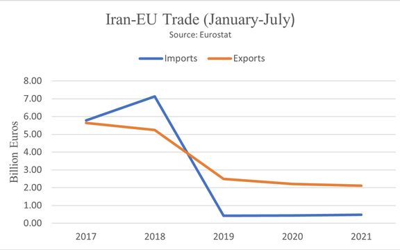 European governments opposed Trump’s unilateral sanctions and tried to convince European companies to trade with Iran. However, the private sector defied Brussels and complied with Washington’s sanctions. Despite loose enforcement of US sanctions by the Biden administration, the data for the first seven months of 2021 show no significant increase in trade between the EU countries and Iran. During this time period, EU’s imports from Iran rose to 480 million euros, slightly higher than 440 million euros during the same period last year, while its exports dropped from 2.21 billion euros to 2.11 billion.