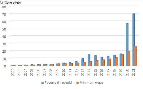 The impact on ordinary people has been devastating. While the minimum income needed to live just above poverty, as the rial lost value, has grown 70-fold in the past 20 years, wages and salaries have increased only 38-fold. While blue collar workers earn around $100-120 per month, office workers make $150-180. The minimum monthly income needed for a family of 3.3 people is $400.