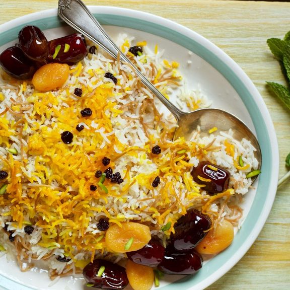 Many families, particularly in central areas where fish was very hard to come by before modern times, make a dish of rice mixed with noodles and served with chicken, dried apricots, and dates instead of the green rice and fish. A stew-like soup with green herbs, legumes and noodles (ash-e reshteh) is also among holiday season foods. Noodles in these dishes symbolize longevity.