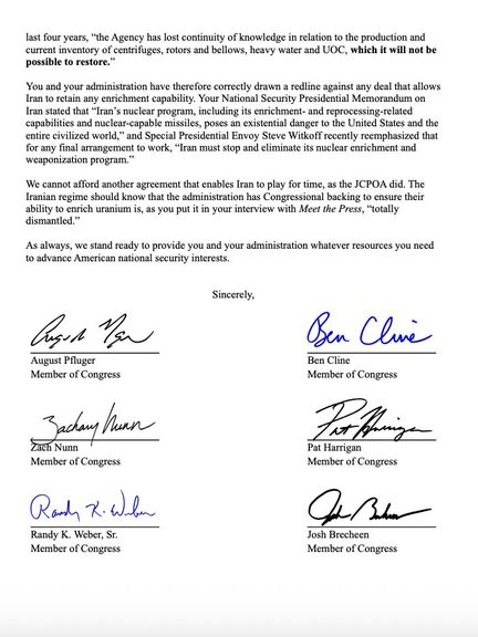 “The United States cannot afford another deal that gives Iran room to maneuver,” the lawmakers wrote. “The regime must be stripped of all enrichment capacity — even for peaceful energy purposes.”