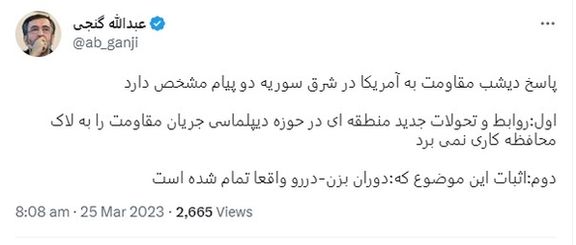 «پاسخ دیشب مقاومت به آمریکا در شرق سوریه دو پیام مشخص دارد. اول: روابط و تحولات جدید منطقهای در حوزه دیپلماسی، جریان مقاومت را به لاک محافظهکاری نخواهد برد. دوم: اثبات این موضوع که: دوران بزن-دررو واقعا تمام شده است.»