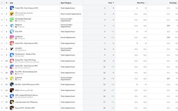 بر اساس دادههای شرکت Data.ai که وضعیت بازار اپلیکیشنها در جهان را رصد میکند، ۲۹ جایگاه از فهرست ۵۰ اپلیکیشن برتر گوگل پلی در ایران در اختیار برنامههای دور زدن فیلترینگ است.