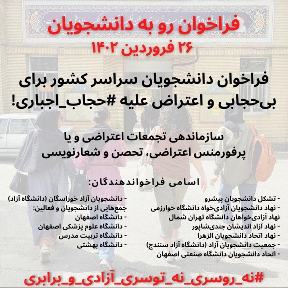 در حالی که اعمال سرکوب علیه شهروندان معترض به «حجاب اجباری» و دیگر سیاستهای ناکارآمد حاکمیت همچنان ادامه دارد، تعدادی از تشکلهای دانشجویی سراسر کشور برای برگزاری تجمع اعتراضی علیه حجاب اجباری در روز ۲۶ فروردین فراخوان دادند.