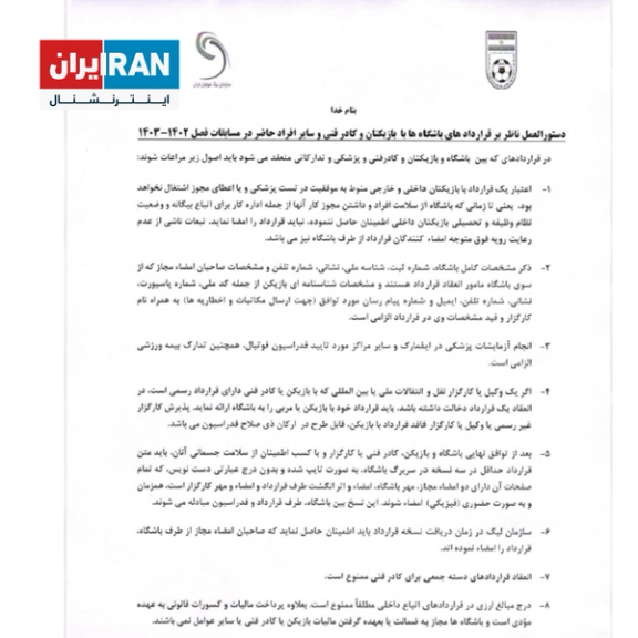 همه باشگاه ها، بازیکنان و مربیان ملزم به رعایت این دستور العمل ۳۰ بندی در قرارداد خود هستند.