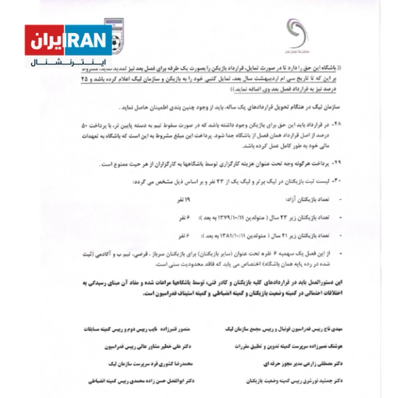 در دستورالعمل جدید آمده؛ «باشگاه این حق را دارد تا در صورت تمایل، قرارداد بازیکن را بصورت یکطرفه برای فصل بعد نیز تمدید کند، مشروط بر اینکه تا سیام اردیبهشت سال بعد تمایل کتبی خود برای تمدید قرارداد را به بازیکنان و سازمان لیگ ابلاغ کرده باشد و ۲۵ درصد به رقم قرارداد برای فصل بعد اضافه کند.»