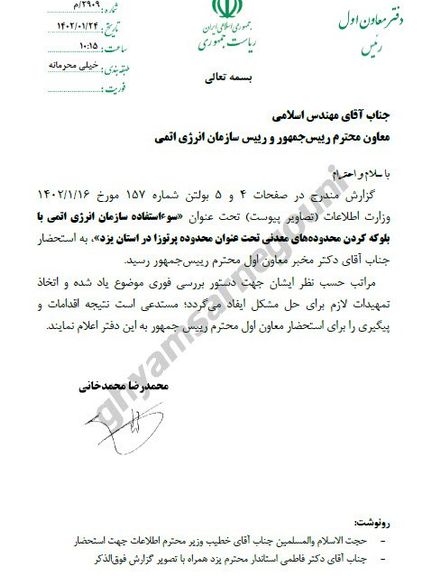 این نامه افشا میکند گزارش «سوءاستفاده سازمان انرژی اتمی با بلوکه کردن محدودههای معدنی، تحت عنوان محدوده پرتوزا در استان یزد» به اطلاع مخبر رسیده و دستور «بررسی فوری» موضوع یاد شده و اتخاذ تمهیدات لازم به منظور «حل مشکل» ایفاد شده است.
