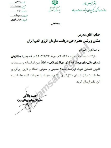 در نامهای دیگر به تاریخ ۲۴ اردیبهشت از سوی معاونت هماهنگی، پیگیریهای ویژه و خدمات مدیریت دفتر ریاستجمهوری، خطاب به سازمان انرژی اتمی به «جایگزینی شورای عالی فنآوری پیشرفته با شورای انرژی اتمی» اشاره شده است.