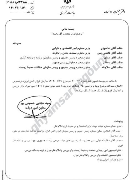 گروه هکری «قیام تا سرنگونی» همچنین سندی را منتشر کرد که حاوی اطلاعاتی درباره درخواست سازمان انرژی اتمی برای اصلاح مصوبات «ورود و ترخیص ۳۵ دستگاه خودرو با حجم موتور بیش از دو هزار و ۵۰۰ سیسی» است.
