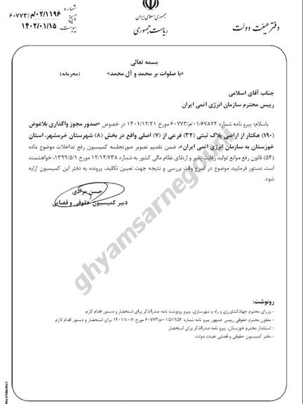 در این سند (نامه) به تاریخ ۲۱ اسفند سال گذشته، به «صدور مجوز واگذاری بلاعوض ۱۹۰ هکتار از اراضی» واقع در خرمشهر در استان خوزستان به سازمان انرژی اتمی اشاره شده و به پیوست، تصویر صورتجلسه کمیسیون رفع تداخلات قانون رفع موانع تولید مبنی بر «احراز تداخل» آمده است.
