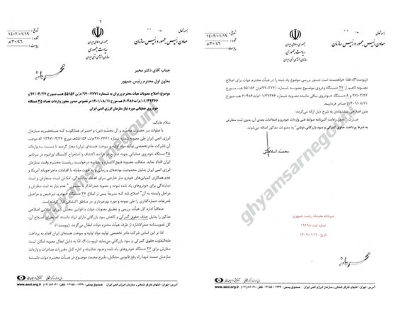 رییس این سازمان در ادامه از هیات دولت خواسته است تا با انجام اصلاحاتی، عبارت «بدون رعایت آییننامه ضوابط فنی واردات خودرو و اصلاحات بعدی آن، بدون ثبت سفارش به شرط پرداخت حقوق گمرگی و سود بازرگانی دولتی» را به مصوبات پیشین اضافه کند.