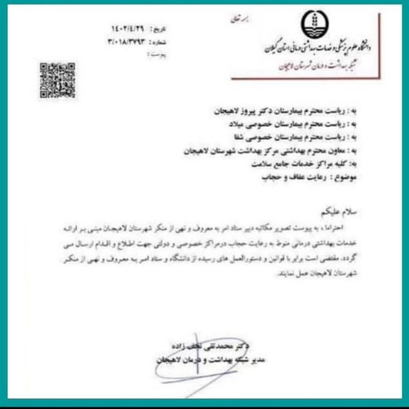 این نامه به امضای محمدتقی نجفزاده، مدیر شبکه بهداشت و درمان شهر لاهیجان رسیده و در آن آمده است که با توجه به مکاتبه دبیر ستاد امر به معروف و نهی از منکر لاهیجان، «ارائه خدمات درمانی منوط به رعایت حجاب در مراکز خصوصی و دولتی است».