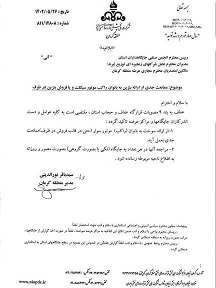 نورالدینی در این نامه با استناد به بند نهم از «مصوبه قرارگاه عفاف و حجاب» استان کرمان از عوامل و دستاندرکاران جایگاهها و مراکز عرضه سوخت خواست تا از ارائه بنزین به زنان راکب موتور، حتی در قالب فروش در ظرف، «به طور جدی» خودداری کنند.