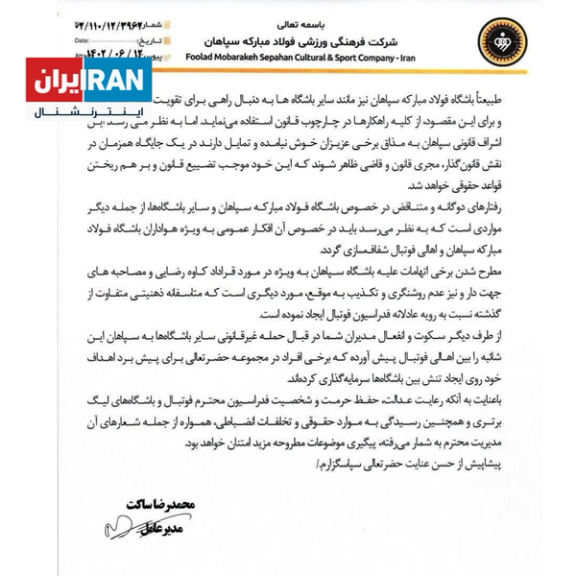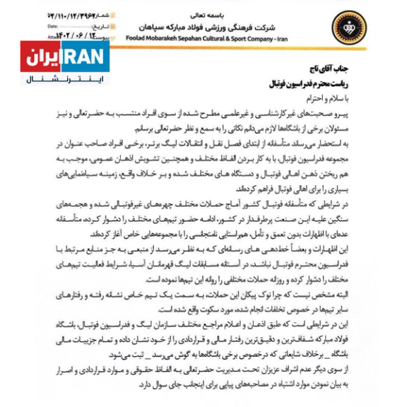 مدیرعامل باشگاه سپاهان در نامهای به مهدی تاج از او خواسته رفتار مسئولان تحت امر خود در فدراسیون فوتبال را کنترل کرده تا صحبتهایشان در خصوص این باشگاه، شائبهبرانگیز نباشد. نامهای که به نوعی واکنش باشگاه سپاهان به شکایت استقلال و پرسپولیس و صحبتهای مسئولان مختلف فدراسیون است.