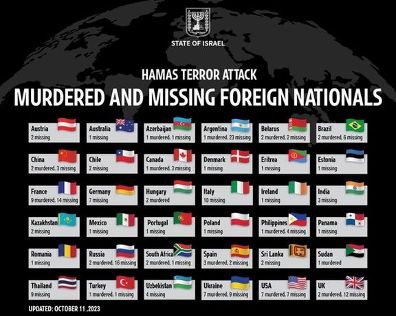 این در حالی است که پیش از این واشینگتن پست در گزارشی در روز ۱۹ مهر اعلام کرده بود شهروندان ۲۳ کشور در حملات حماس کشته یا مفقود شدهاند.