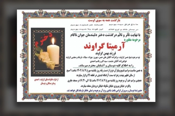 بر اساس گزارشها مراسم تشییع آرمیتا گراوند یکشنبه در بهشت زهرا برگزار خواهد شد