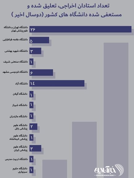 خبرآنلاین در ادامه گزارش خود آورده است در دو سال گذشته حدود ۶۰ استاد از دانشگاههای سراسر کشور اخراج، تعلیق یا مجبور به استعفا شدهاند که بیشترین آمار به دانشگاه تهران و دانشگاه علوم پزشکی تهران با ۲۶ استاد اخراجی یا تعلیقی تعلق دارد.