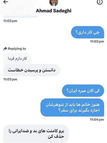 بنابر گفته این کاربر ایرانی-استرالیایی شبکه ایکس، حساب منتسب به احمد صادقی، سفیر جمهوری اسلامی در استرالیا، روز یکشنبه پانزدهم بهمن ماه، با ارسال پیام خصوصی به این کاربر گفته که او باید «کامنتهای بد» خود را پاک کند.