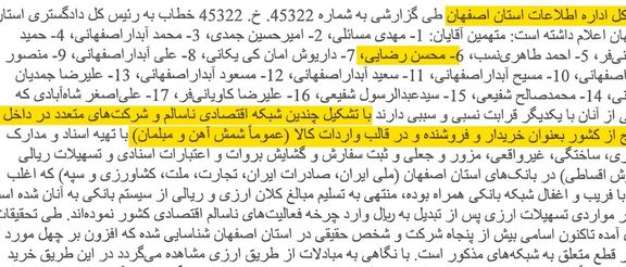 مدیرکل اداره اطلاعات استان اصفهان در گزارشی خطاب به رییس کل دادگستری استان اصفهان اعلام کرده بود: «متهمین آقایان: مهدی مسائلی، امیرحسین جمدی، محمد آبداراصفهانی، حمید کاویانیفر، احمد طاهرینسب، محسن رضایی، داریوش امان کی یکانی، علی آبدار اصفهانی، منصور آبدار اصفهانی، مسیح آبدار اصفهانی، سعید آبدار اصفهانی، مسعود آبدار اصفهانی، علیرضا جمدیان خیابانی، محمدصالح شفیعی، سیدعبدالرسول شفیعی، علیرضا کاویانیفر، علی اصغر شاهآبادی که برخی از آنان با یکدیگر قرابت نسبی و سببی دارند، با تشکیل چندین شبکه اقتصادی ناسالم و شرکتهای متعدد داخل و خارج از کشور به عنوان خریدار و فروشنده و در قالب واردات کالا با اغفال و فریب شبکه بانکی مبالغ کلان ارزی و ریالی را از سیستم بانکی خارج کرده و پس ندادهاند.»
