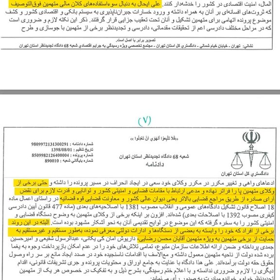 در سال ۹۸ دادگاه ۶۸ تجدید نظر رای پرونده محسن رضایی را صادر کرد.قاضی دادگاه به صراحت در حکم چنین آورد: «... برخی از متهمین با جوسازی و طرح ادعاهای واهی و تغییر مکرر در مکرر وکلای خود سعی در ایجاد انحراف در مسیر پرونده را داشته و حتی برخی از وکلای متهمین پا را فراتر نهاده و مدعی ارتباط با مقامات قضایی و امنیتی کشور و توانایی و قدرت لازم برای نقض رای صادره از طریق مراجع قضایی بالاتر یعنی دیوان عالی کشور و معاونت قضایی قوه قضاییه در راستای اعمال ماده ۱۸ اصلاح قانون تشکیل دادگاههای عمومی و انقلاب... شدهاند.»