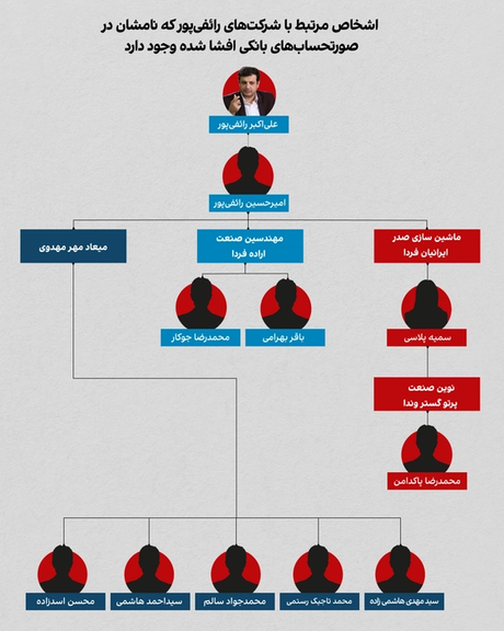 محمدرضا پاکدامن: او رییس هیات مدیره شرکت «نوین صنعت پرتو گستر وندا» است؛شرکتی که یکی از سهامداران آن سمیه پلاسی است. سمیه پلاسی در زمان تاسیس شرکت «ماشینسازی صدر ایرانیان فردا»، یکی از شرکتهای برادر علیاکبر رائفیپور به عنوان مدیرعامل آن معرفی شده بود.