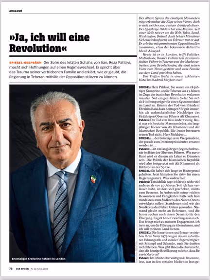 شاهزاده رضا پهلوی در گفتوگو با نشریه آلمانی اشپیگل با اشاره به خیزشهای اخیر در ایران علیه جمهوری اسلامی گفت خواهان انقلاب است و مردم ایران میدانند که اگر «از شر این رژیم خلاص نشویم، کشور محکوم به فناست».