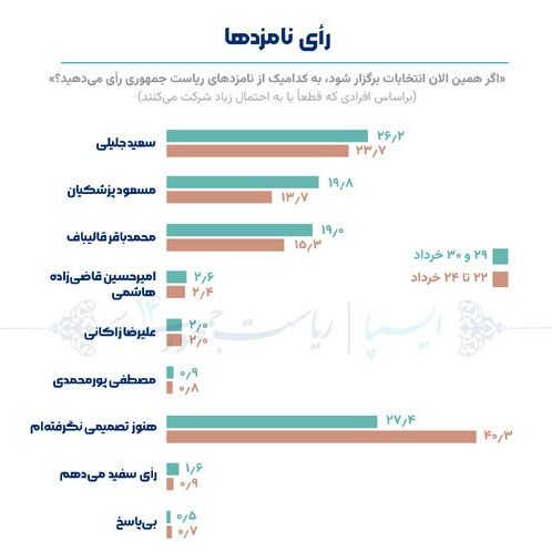 از میان افرادی که مشارکتشان را در انتخابات قطعی اعلام کردند، ۲۶/۲ درصدشان گفتهاند به جلیلی، ۱۹/۸ درصد اعلام کردهاند به پزشکیان و ۱۹ درصد گفتهاند به قالیباف رای میدهند.