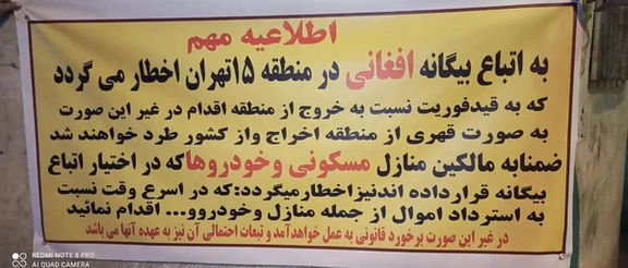 در این اطلاعیه که فرد یا نهاد منتشر کننده آن مشخص نیست، به مهاجران افغان اخطار داده شده است که اگر از منطقه ۱۵ نروند، «به صورت قهری از ایران اخراج خواهند شد».