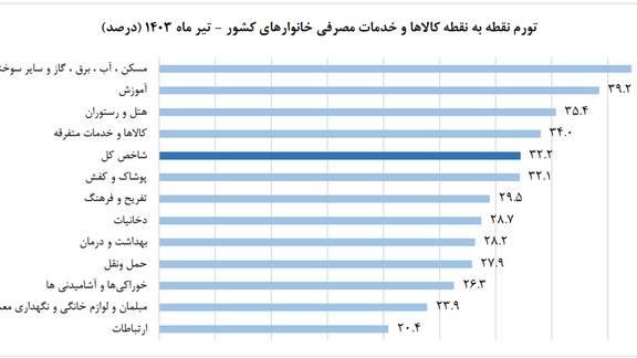 بالاترین میزان تورم به ترتیب در گروههای: هتل و رستوران۴۹/۷ درصد، پوشاک و کفش۴۱/۵ درصد و مسکن، آب، برق، گاز و سایر سوختها ۴۰/۳ درصد ثبت شده است.