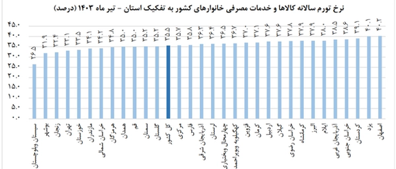 استانهای اصفهان با ۴۰/۲ درصد، یزد با ۴۰/۱ درصد و کردستان با ۳۹/۱ درصد بالاترین نرخ تورم سالانه را به خود اختصاص دادند. از طرف دیگر، استانها سیستان و بلوچستان با ۲۶/۵ درصد، بوشهر با ۳۱/۹ درصد و زنجان با ۳۲/۴ درصد، کمترین نرخ تورم سالانه را داشتند.