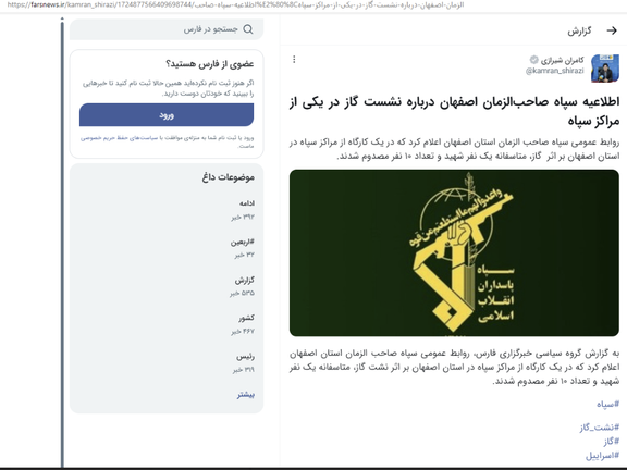 روابط عمومی سپاه اصفهان اعلام کرد که تعداد کشتهشدگان «نشت گاز» در یکی از کارگاههای مراکز سپاه در این استان به دو نفر رسید. بنابر این خبر سروان پاسدار مجتبی نظری و سرهنگ دوم پاسدار مختار مرشدی در این حادثه کشته شدند.