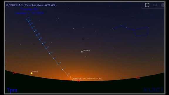 دنبالهدار سوچینشان-اطلس هماکنون در فاصله کمی از خورشید در صورت فلکی دوشیزه یل ویرگو قرار داد و در روزهای آتی از خورشید دورتر و دورتر میشود. این دنبالهدار به تدریج ارتفاع بیشتری در آسمان پیدا میکند و تشخیص آن آسانتر میشود.