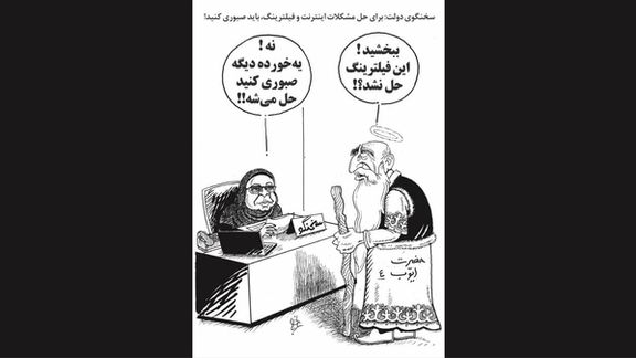 در این کاریکاتور، یکی از کاراکترها که نامش «حضرت ایوب» عنوان شده، مقابل کاراکتر مهاجرانی قرار گرفته و از او میپرسد: «ببخشید! این فیلترینگ حل نشد؟»