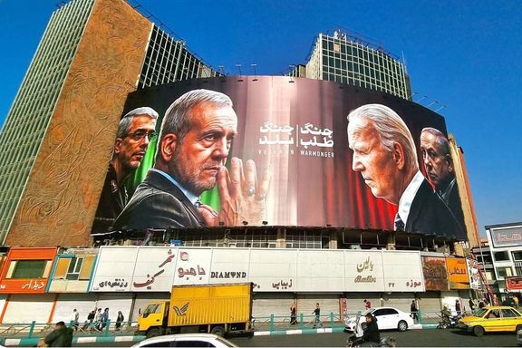 در تصویر دیوارنگاره میدان ولیعصر، در یک طرف مسعود پزشکیان و محمد باقری، رییس ستادکل نیروهای مسلح با عنوان «جنگ بلد» و در طرف دیگر جو بایدن و بنیامین نتانیاهو با عنوان «جنگطلب» قرار دارند.