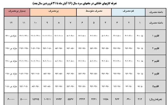در ماهههای گرم سال که از اول اردیبهشت تا ۱۵ آبانماه در نظر گرفته میشود، میزان مصرف پایه در تمامی اقلیمهای کشور برابر در نظر گرفته میشود. اما در ماههای سرد که از ۱۶ آبان تا ۳۱ فروردین است، تعرفه گاز بر اساس میزان مصرف در اقلیمهای مختلف کشور، متفاوت است.