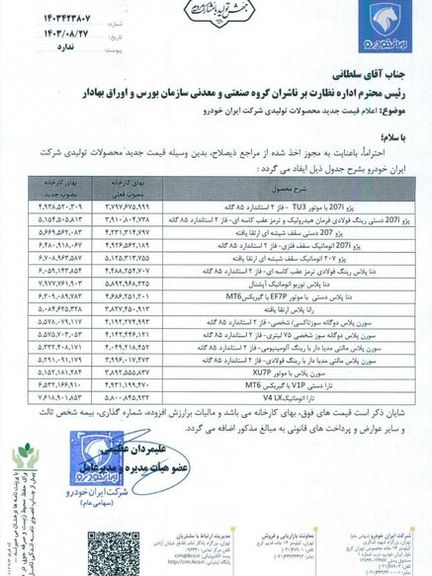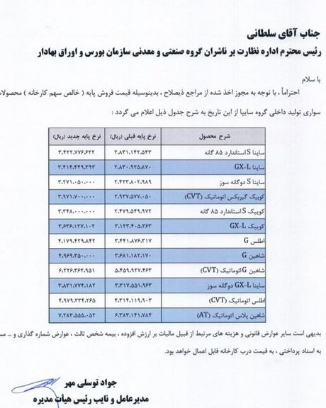 خبرگزاری ایسنا روز دوشنبه ۲۸ آبان تصویر اطلاعیههای جدید علیمردان عظیمی، مدیرعامل گروه خودروسازی ایرانخودرو و جواد توسلیمهر، مدیرعامل گروه خودروسازی سایپا را منتشر کرد که شامل فهرست قیمتهای جدید محصولات این شرکتهاست.