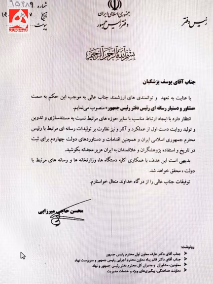 پیش از او، حسن مجیدی، داماد مسعود پزشکیان و شوهر خواهر یوسف پزشکیان، در حکمی از سوی حاجی میرزایی به عنوان دستیار ویژه دفتر رییسجمهوری منصوب شده بود.