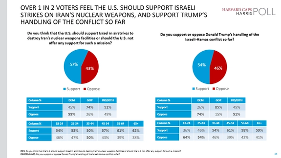 براساس نتایج یک نظرسنجی که از سوی دانشگاه هاروارد و موسسه نظرسنجی هریس انجام گرفته است، اکثریت قاطع کسانی که در این نظرسنجی شرکت کردهاند خواهان اجرای حملات پیشگیرانه علیه تاسیسات هستهای ایران، اخراج دائمی حماس از غزه و حمایت از عملیات نظامی اسرائیل علیه این گروه هستند.