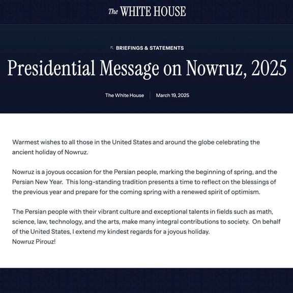 ترامپ در پیامی که کاخ سفید منتشر کرده است نوشت: «نوروز مناسبتی شادیبخش برای مردم ایران است که آغاز بهار و سال نو خورشیدی را رقم میزند. این سنت دیرینه فرصتی برای تامل بر نعمتهای سال گذشته و آمادگی برای بهاری تازه با روحیهای نو و امیدبخش فراهم میکند.»