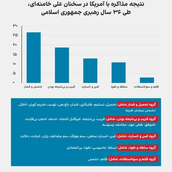 ۲۶ درصد از نتایج به گروه «ضرر» با کلیدواژههای «ضرر، خسارت محض، سم مهلک، سم مضاعف، زیان، خیانت و دخالت» اشاره دارد که بیانگر باور رهبر جمهوری اسلامی به ضرر در مذاکره با آمریکاست.