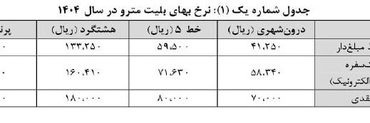 بر اساس مصوبه شورای شهر تهران، نرخ هر سفر درونشهری مترو تهران با کارت بلیت مبلغدار به چهار هزار و ۱۲۵ تومان، نرخ بلیت تکسفره به پنج هزار و ۸۳۴ تومان و نرخ بلیت نقدی به هفت هزار تومان افزایش پیدا کرده است.