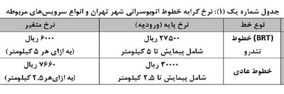 برای اتوبوسهای خطوط عادی نیز شهروندان باید برای ورود و طی مسافتی تا دو و نیم کیلومتر، سه هزار تومان و به ازای هر دو و نیم کیلومتر دیگر، ۷۶۶ تومان پرداخت کنند.