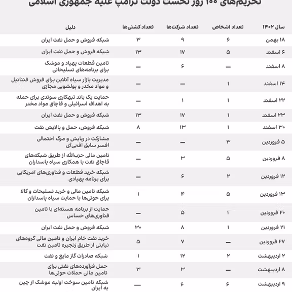 تنها کمتر از دو هفته پس از آغاز دور دوم ریاستجمهوری دونالد ترامپ کارزار تازهای از سیاست «فشار حداکثری» علیه جمهوری اسلامی به راه افتاد. در صد روز نخست، دولت ترامپ در مجموع ۱۷ دور تحریم مرتبط با جمهوری اسلامی اعمال کرد که طی آن ۴۰ شخص، ۱۱۷ شرکت و نهاد و ۷۷ نفتکش هدف قرار گرفتند.