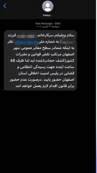 از اواخر فروردین ۱۴۰۴، تحول در اجرای سیاست حجاب اجباری لایههای تازهای از ترس، ابهام و بیاعتمادی را به جامعه تحمیل کرد: ارسال پیامک درباره تخلف ادعایی زنان از قانون حجاب که در مواردی برای مردان خانواده فرستاده شده است.