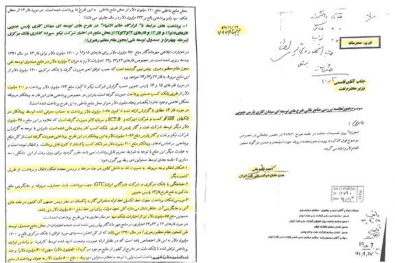 این سند صورتجلسه مذاکراتی در سال ۱۳۹۱ در وزارت نفت درباره طرحهای توسعه میدان گازی پارس جنوبی است که احمد قلعهبانی، رییس وقت شرکت ملی نفت به رستم قاسمی، وزیر وقت نفت ارائه کرده و در آن تصریح شده که با دستور علی خامنهای، رهبر جمهوری اسلامی، مبلغ قابلتوجهی از صندوق توسعه ملی در اختیار قرارگاه خاتمالانبیاء سپاه پاسداران قرار گرفته تا صرف توسعه چند فاز از پارس جنوبی شود.