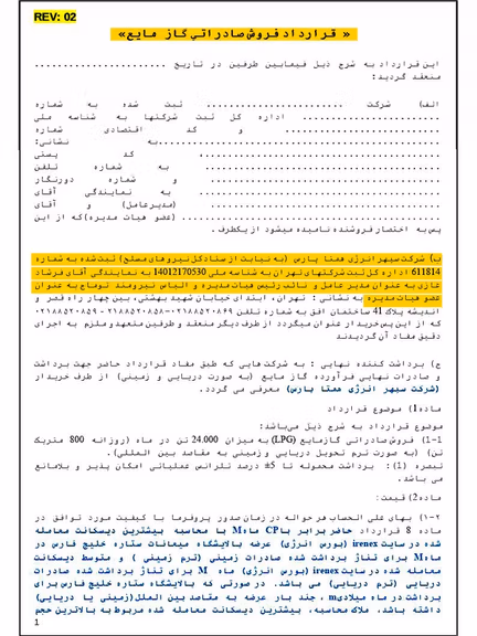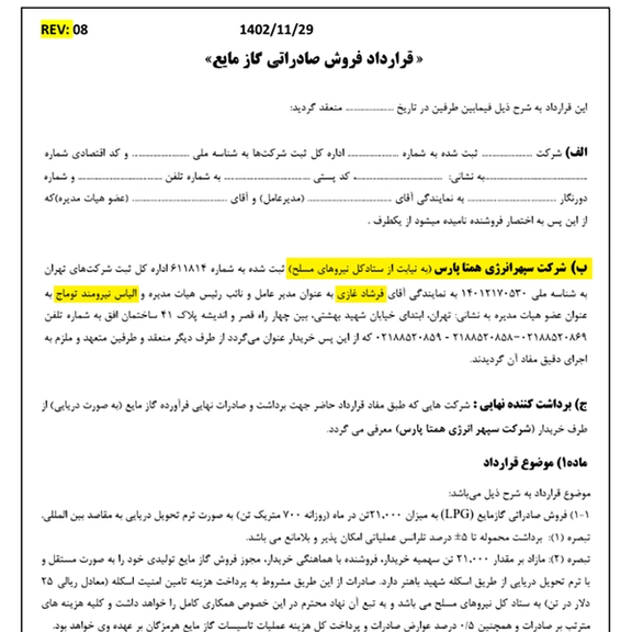 در سندی دیگر که پیشنویس یک قرارداد فروش گاز مایع است، شرکت سپهر انرژی همتا پارس بهطور مشخص نماینده ستاد کل نیروهای مسلح معرفی شده است.