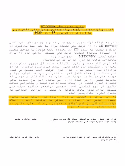 همچنین در سندی دیگر که پیشنویس اجاره کشتی تحریمی Downy متعلق به شرکت ملی نفتکش ایران است، قرارگاه نفت و پتروپالايشگاه ستاد كل نيروى مسلح تمام تعهدات و مسوولیت شرکت سپهر انرژی جهاننمای پارس را تضمین میکند.