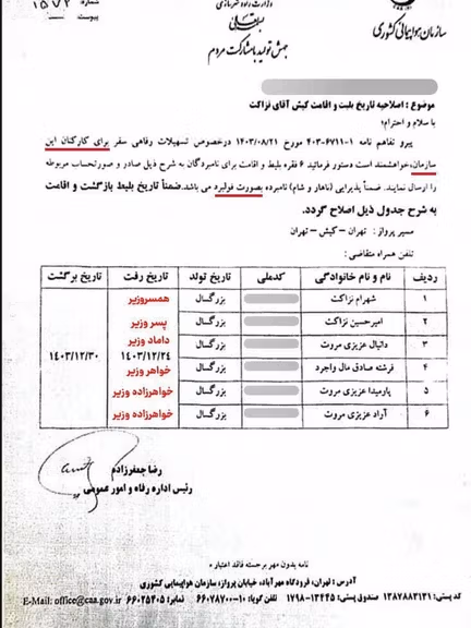 این سند نامه رییس اداره رفاهی سازمان هواپیمایی کشوری، از زیرمجموعههای وزارت راه است که در آن با اشاره به نام تکتک اعضای خانواده فرزانه صادق، تایید شده هزینه اقامت این افراد در کیش با تمام امکانات را وزارت راه میپردازد.