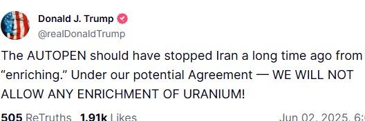 دونالد ترامپ بعدازظهر دوشنبه ۱۲ خرداد، در پستی در شبکه اجتماعی خود، تروث سوشیال، با انتقاد از عملکرد جو بایدن، رییسجمهوری پیشین آمریکا، تاکید کرد که در یک توافق احتمالی با جمهوری اسلامی، آمریکا اجازه هیچگونه غنیسازی اورانیوم را به حکومت ایران نخواهد داد.