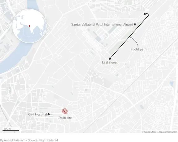 تلویزیونهای هند گزارش دادند لحظاتی بعد از برخاستن هواپیما، تصاویر ویدیویی نشان دادهاند که هواپیما با عبور از منطقهای مسکونی، ناپدید شده و سپس تودهای عظیم از دود و آتش از پشت ساختمانها به هوا برخاسته است.